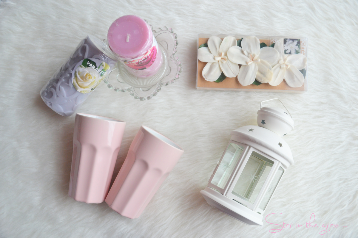 qui ne me déplait pas du tout, hihi. J’avais envie d’apporter un peu de douceur supplémentaire à la décoration de ma chambre et quoi de mieux que de belles bougies, des fleurs et d’une lanterne étoilée. J’ai donc acheté : deux bougies VARAKTIG en gris à la vanille et en rose à la rose, le bougeoir FÖRTJUST qui me servira soit à poser mes bougies soit à contenir quelques bijoux, des petites fleurs DOFTA à accrocher aux poignées et une lanterne ROTERA. J’ai également acheté deux tasses POKAL (gobelets) toutes douces pour me réchauffer lorsqu’il fait froid avec un bon chocolat chaud.