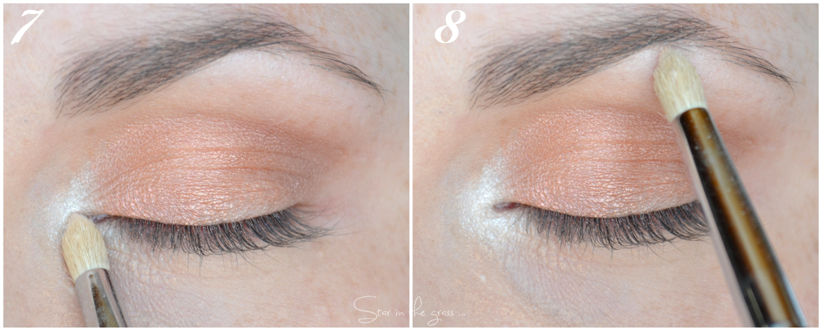 le coin externe de l’œil et sous l’arcade sourcilière, je viens appliquer le 1er fard de la palette afin d’apporter une touche lumière : un blanc.